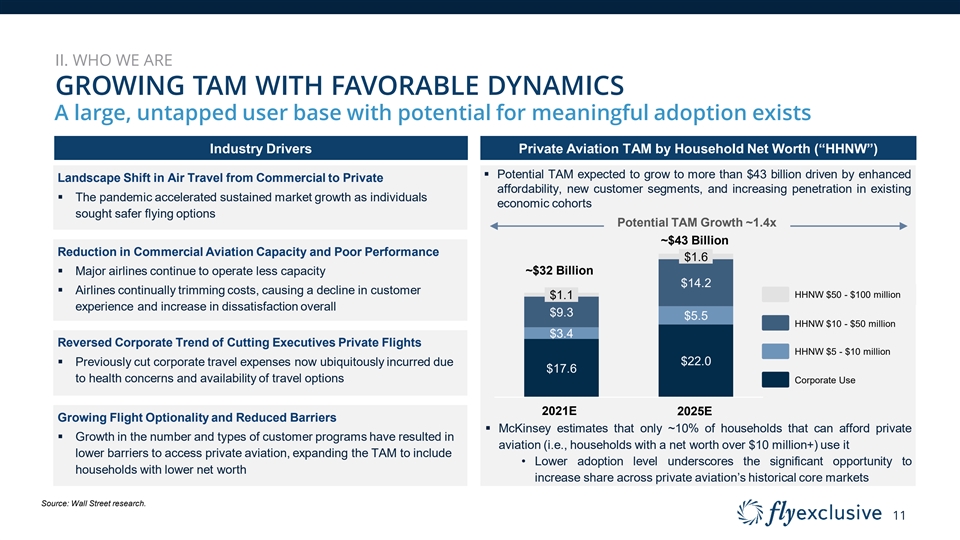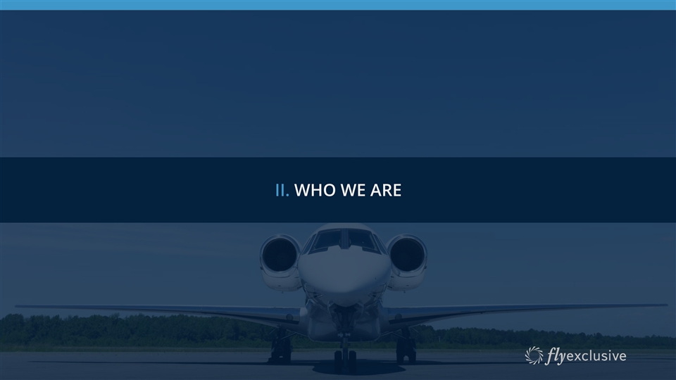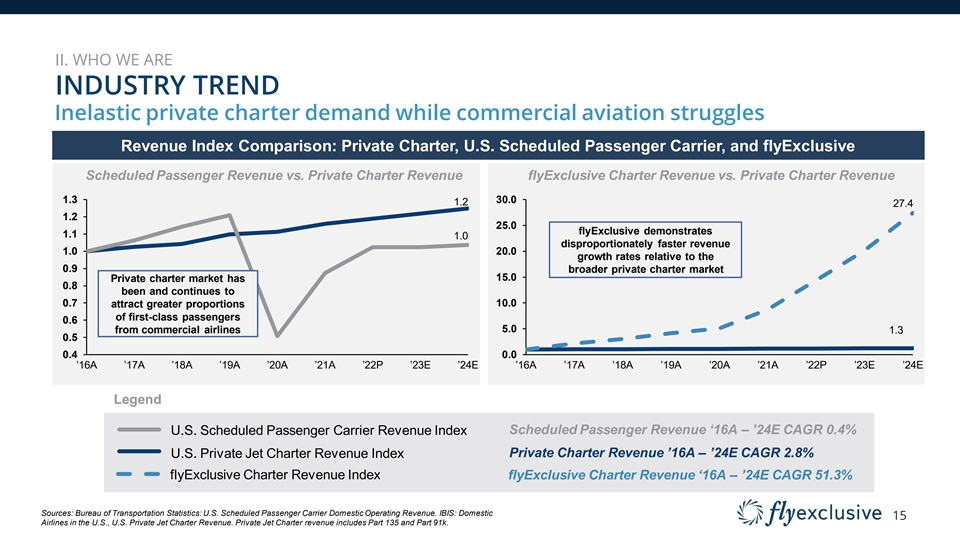 II. WHO WE ARE INDUSTRY TREND Inelastic private charter demand while commercial aviation struggles Revenue Index Comparison: Private Charter, U.S. Scheduled Passenger Carrier, and flyExclusive Scheduled Passenger Revenue vs. Private Charter Revenue flyExclusive Charter Revenue vs. Private Charter Revenue 1.3 30.0 1.2 27.4 1.2 25.0 flyExclusive demonstrates 1.1 1.0 disproportionately faster revenue 1.0 20.0 growth rates relative to the 0.9 broader private charter market 15.0 Private charter market has 0.8 been and continues to 0.7 10.0 attract greater proportions of first-class passengers 0.6 5.0 from commercial airlines 1.3 0.5 0.4 0.0 ’16A ’17A ’18A ’19A ’20A ’21A ’22P ’23E ’24E ’16A ’17A ’18A ’19A ’20A ’21A ’22P ’23E ’24E Legend U.S. Scheduled Passenger Carrier Revenue Index Scheduled Passenger Revenue ‘16A – ’24E CAGR 0.4% Private Charter Revenue ’16A – ’24E CAGR 2.8% U.S. Private Jet Charter Revenue Index flyExclusive Charter Revenue Index flyExclusive Charter Revenue ‘16A – ’24E CAGR 51.3% Sources: Bureau of Transportation Statistics: U.S. Scheduled Passenger Carrier Domestic Operating Revenue. IBIS: Domestic 15 Airlines in the U.S., U.S. Private Jet Charter Revenue. Private Jet Charter revenue includes Part 135 and Part 91k.