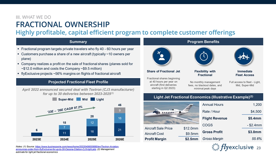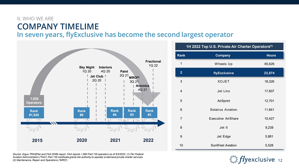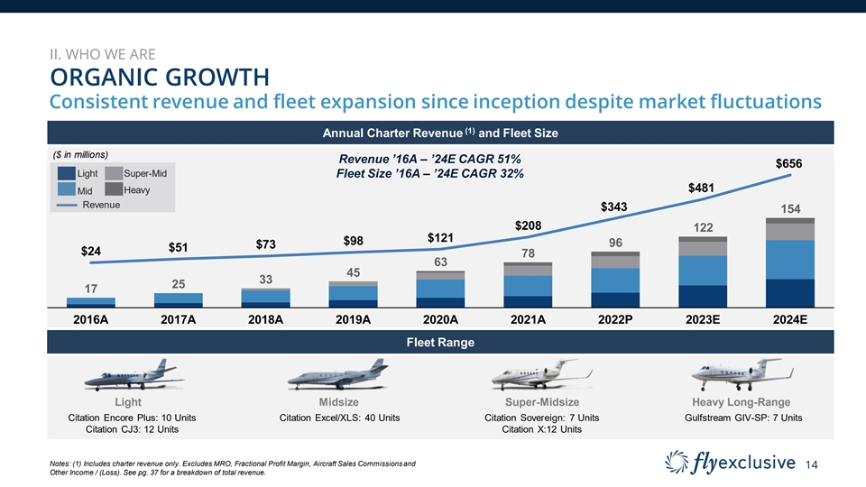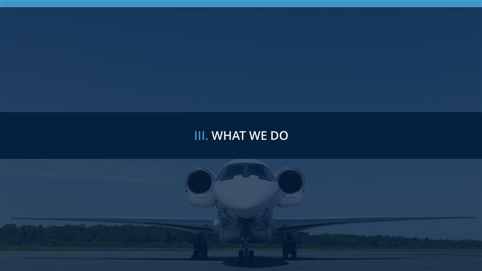 II. WHO WE ARE ORGANIC GROWTH Consistent revenue and fleet expansion since inception despite market fluctuations (1) Annual Charter Revenue and Fleet Size ($ in millions) Revenue ’16A – ’24E CAGR 51% $656 Light Super-Mid Fleet Size ’16A – ’24E CAGR 32% $481 Heavy Mid Revenue $343 154 $208 122 $121 $98 96 $73 $51 $24 78 63 45 33 25 17 2016A 2017A 2018A 2019A 2020A 2021A 2022P 2023E 2024E Fleet Range Light Midsize Super-Midsize Heavy Long-Range Citation Encore Plus: 10 Units Citation Excel/XLS: 40 Units Citation Sovereign: 7 Units Gulfstream GIV-SP: 7 Units Citation CJ3: 12 Units Citation X:12 Units Notes: (1) Includes charter revenue only. Excludes MRO, Fractional Profit Margin, Aircraft Sales Commissions and 14 Other Income / (Loss). See pg. 37 for a breakdown of total revenue.