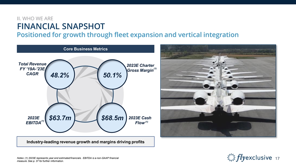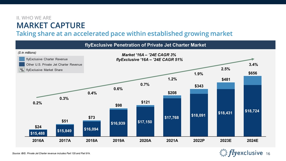 II. WHO WE ARE MARKET CAPTURE Taking share at an accelerated pace within established growing market flyExclusive Penetration of Private Jet Charter Market ($ in millions) Market ’16A – ’24E CAGR 3% flyExclusive Charter Revenue flyExclusive ’16A – ’24E CAGR 51% Other U.S. Private Jet Charter Revenue 3.4% 2.5% flyExclusive Market Share % $656 1.9% 1.2% $481 0.7% $343 0.6% $208 0.4% 0.3% $121 0.2% $98 $18,724 $18,431 $18,091 $73 $17,768 $51 $17,150 $16,939 $24 $16,094 $15,849 $15,488 2016A 2017A 2018A 2019A 2020A 2021A 2022P 2023E 2024E Source: IBIS. Private Jet Charter revenue includes Part 135 and Part 91k. 16