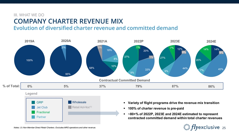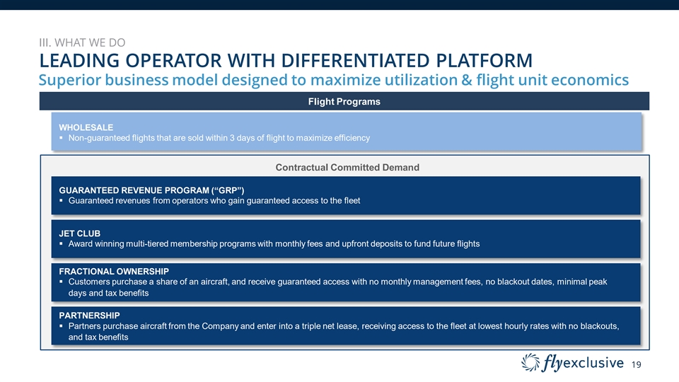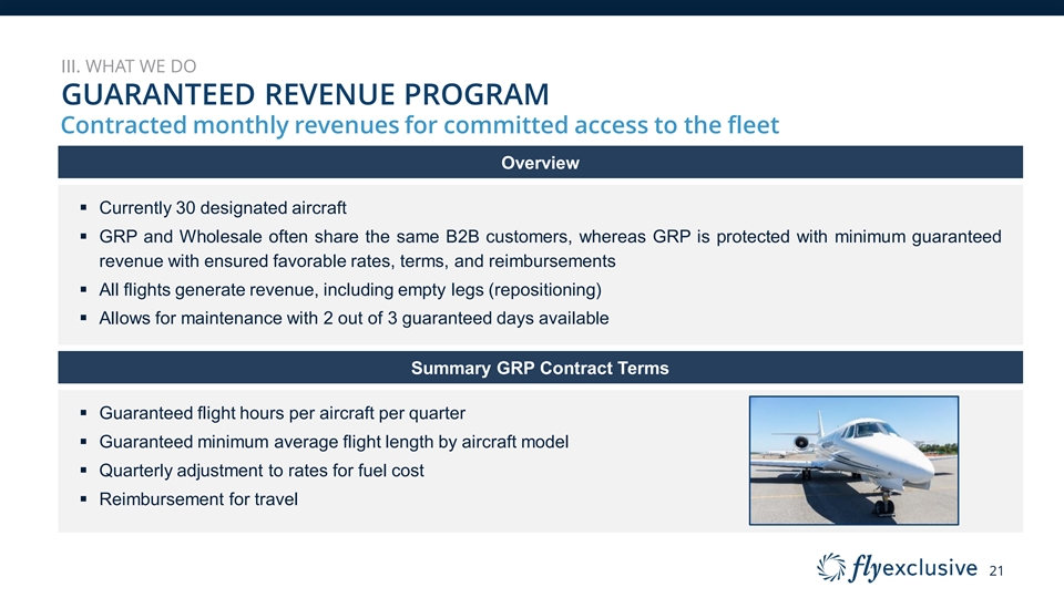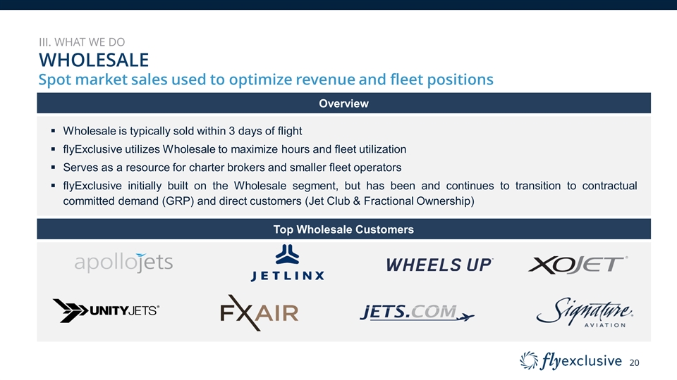 III. WHAT WE DO WHOLESALE Spot market sales used to optimize revenue and fleet positions Overview ▪ Wholesale is typically sold within 3 days of flight ▪ flyExclusive utilizes Wholesale to maximize hours and fleet utilization ▪ Serves as a resource for charter brokers and smaller fleet operators ▪ flyExclusive initially built on the Wholesale segment, but has been and continues to transition to contractual committed demand (GRP) and direct customers (Jet Club & Fractional Ownership) Top Wholesale Customers 20
