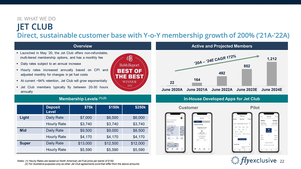 III. WHAT WE DO JET CLUB Direct, sustainable customer base with Y-o-Y membership growth of 200% (’21A-’22A) Overview Active and Projected Members ▪ Launched in May ‘20, the Jet Club offers non-refundable, multi-tiered membership options, and has a monthly fee 1,212 ▪ Daily rates subject to an annual increase 852 ▪ Hourly rates increased annually based on CPI and 492 adjusted monthly for changes in jet fuel costs 164 ▪ At current ~94% retention, Jet Club will grow exponentially 22 ▪ Jet Club members typically fly between 20-30 hours June 2020A June 2021A June 2022A June 2023E June 2024E annually (1),(2) Membership Levels In-House Developed Apps for Jet Club Deposit $75k $150k $250k Customer Pilot Level Light Daily Rate $7,000 $6,500 $6,000 Hourly Rate $3,740 $3,740 $3,740 Mid Daily Rate $9,500 $9,000 $8,500 Hourly Rate $4,170 $4,170 $4,170 Super Daily Rate $13,000 $12,500 $12,000 Hourly Rate $5,590 $5,590 $5,590 Notes: (1) Hourly Rates are based on North American Jet Fuel price per barrel of $150. 22 (2) For illustrative purposes only as other Jet Club agreements exist that differ from the above amounts.