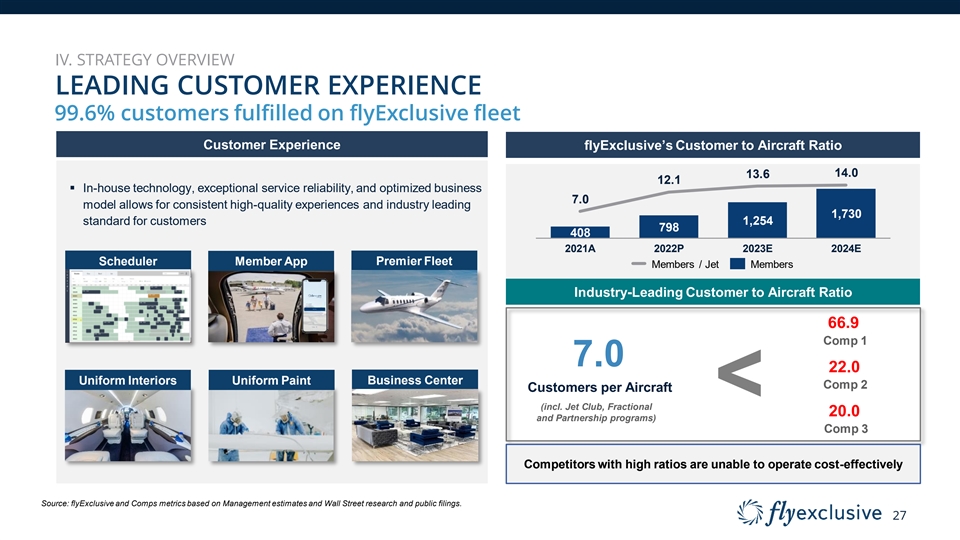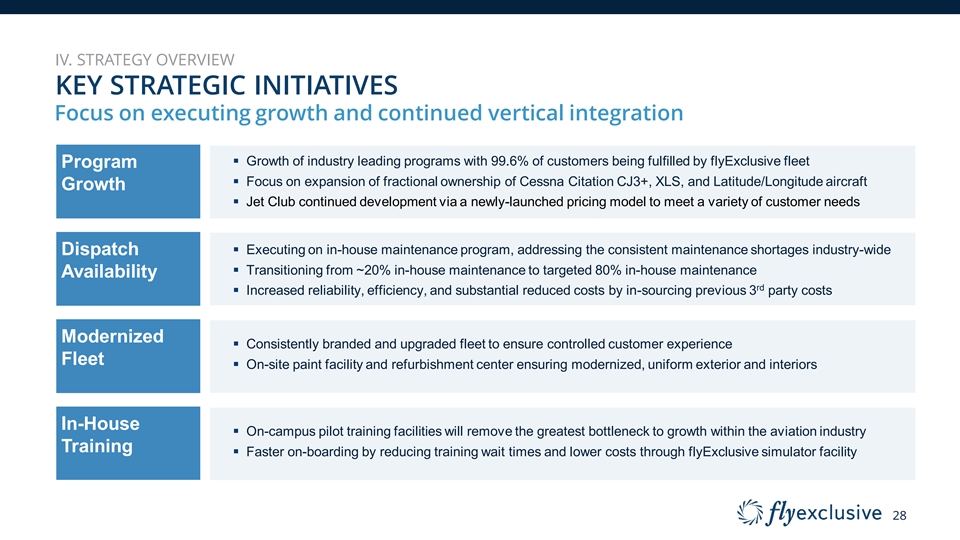 IV. STRATEGY OVERVIEW LEADING CUSTOMER EXPERIENCE 99.6% customers fulfilled on flyExclusive fleet Customer Experience flyExclusive’s Customer to Aircraft Ratio 14.0 13.6 12.1 ▪ In-house technology, exceptional service reliability, and optimized business 7.0 model allows for consistent high-quality experiences and industry leading 1,730 standard for customers 1,254 798 408 2021A 2022P 2023E 2024E Scheduler Member App Premier Fleet Members / Jet Members Industry-Leading Customer to Aircraft Ratio 66.9 Comp 1 7.0 22.0 Business Center Uniform Interiors Uniform Paint Comp 2 Customers per Aircraft < (incl. Jet Club, Fractional 20.0 and Partnership programs) Comp 3 Competitors with high ratios are unable to operate cost-effectively Source: flyExclusive and Comps metrics based on Management estimates and Wall Street research and public filings. 27