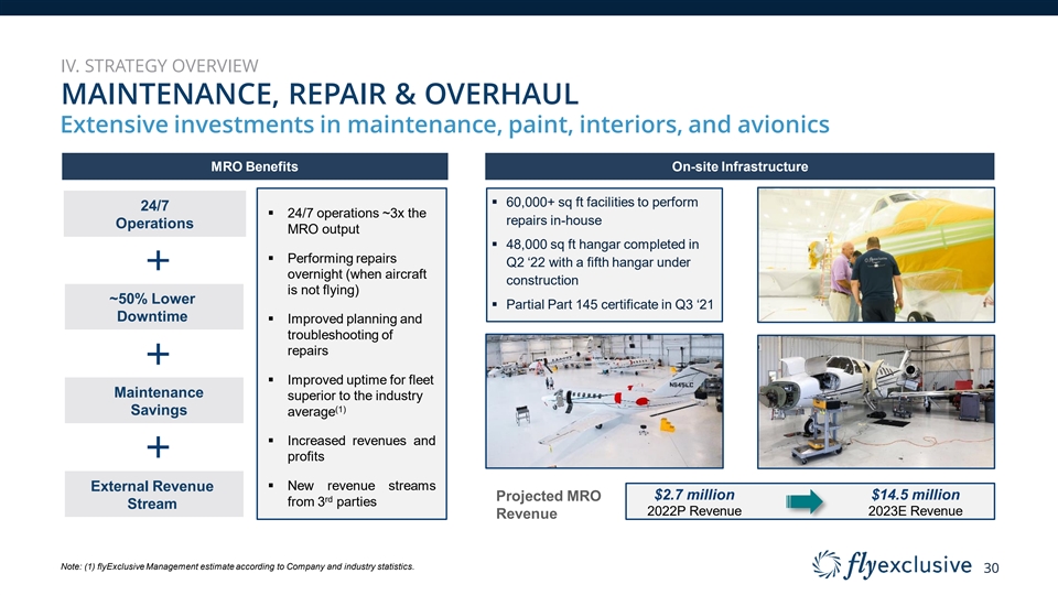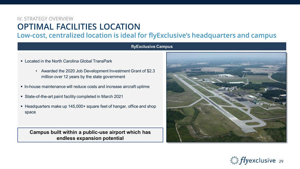 IV. STRATEGY OVERVIEW OPTIMAL FACILITIES LOCATION Low-cost, centralized location is ideal for flyExclusive’s headquarters and campus flyExclusive Campus ▪ Located in the North Carolina Global TransPark • Awarded the 2020 Job Development Investment Grant of $2.3 million over 12 years by the state government ▪ In-house maintenance will reduce costs and increase aircraft uptime ▪ State-of-the-art paint facility completed in March 2021 ▪ Headquarters make up 145,000+ square feet of hangar, office and shop space Campus built within a public-use airport which has endless expansion potential 29