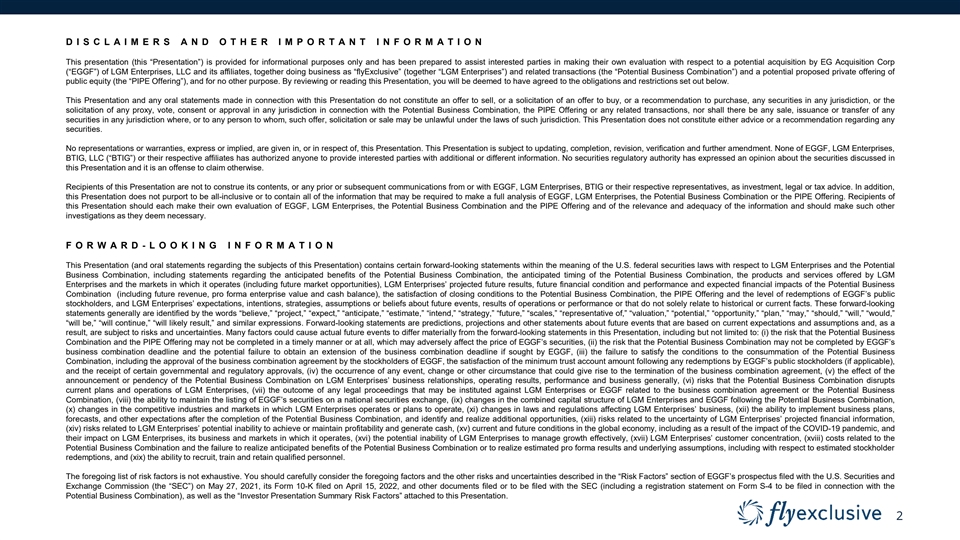 D I S C L A I M E R S A N D O T H E R I M P O R T A N T I N F O R M A T I O N This presentation (this “Presentation”) is provided for informational purposes only and has been prepared to assist interested parties in making their own evaluation with respect to a potential acquisition by EG Acquisition Corp (“EGGF”) of LGM Enterprises, LLC and its affiliates, together doing business as “flyExclusive” (together “LGM Enterprises”) and related transactions (the “Potential Business Combination”) and a potential proposed private offering of public equity (the “PIPE Offering”), and for no other purpose. By reviewing or reading this Presentation, you will be deemed to have agreed to the obligations and restrictions set out below. This Presentation and any oral statements made in connection with this Presentation do not constitute an offer to sell, or a solicitation of an offer to buy, or a recommendation to purchase, any securities in any jurisdiction, or the solicitation of any proxy, vote, consent or approval in any jurisdiction in connection with the Potential Business Combination, the PIPE Offering or any related transactions, nor shall there be any sale, issuance or transfer of any securities in any jurisdiction where, or to any person to whom, such offer, solicitation or sale may be unlawful under the laws of such jurisdiction. This Presentation does not constitute either advice or a recommendation regarding any securities. No representations or warranties, express or implied, are given in, or in respect of, this Presentation. This Presentation is subject to updating, completion, revision, verification and further amendment. None of EGGF, LGM Enterprises, BTIG, LLC (“BTIG”) or their respective affiliates has authorized anyone to provide interested parties with additional or different information. No securities regulatory authority has expressed an opinion about the securities discussed in this Presentation and it is an offense to claim otherwise. Recipients of this Presentation are not to construe its contents, or any prior or subsequent communications from or with EGGF, LGM Enterprises, BTIG or their respective representatives, as investment, legal or tax advice. In addition, this Presentation does not purport to be all-inclusive or to contain all of the information that may be required to make a full analysis of EGGF, LGM Enterprises, the Potential Business Combination or the PIPE Offering. Recipients of this Presentation should each make their own evaluation of EGGF, LGM Enterprises, the Potential Business Combination and the PIPE Offering and of the relevance and adequacy of the information and should make such other investigations as they deem necessary. F O R W A R D - L O O K I N G I N F O R M A T I O N This Presentation (and oral statements regarding the subjects of this Presentation) contains certain forward-looking statements within the meaning of the U.S. federal securities laws with respect to LGM Enterprises and the Potential Business Combination, including statements regarding the anticipated benefits of the Potential Business Combination, the anticipated timing of the Potential Business Combination, the products and services offered by LGM Enterprises and the markets in which it operates (including future market opportunities), LGM Enterprises’ projected future results, future financial condition and performance and expected financial impacts of the Potential Business Combination (including future revenue, pro forma enterprise value and cash balance), the satisfaction of closing conditions to the Potential Business Combination, the PIPE Offering and the level of redemptions of EGGF’s public stockholders, and LGM Enterprises’ expectations, intentions, strategies, assumptions or beliefs about future events, results of operations or performance or that do not solely relate to historical or current facts. These forward-looking statements generally are identified by the words “believe,” “project,” “expect,” “anticipate,” “estimate,” “intend,” “strategy,” “future,” “scales,” “representative of,” “valuation,” “potential,” “opportunity,” “plan,” “may,” “should,” “will,” “would,” “will be,” “will continue,” “will likely result,” and similar expressions. Forward-looking statements are predictions, projections and other statements about future events that are based on current expectations and assumptions and, as a result, are subject to risks and uncertainties. Many factors could cause actual future events to differ materially from the forward-looking statements in this Presentation, including but not limited to: (i) the risk that the Potential Business Combination and the PIPE Offering may not be completed in a timely manner or at all, which may adversely affect the price of EGGF’s securities, (ii) the risk that the Potential Business Combination may not be completed by EGGF’s business combination deadline and the potential failure to obtain an extension of the business combination deadline if sought by EGGF, (iii) the failure to satisfy the conditions to the consummation of the Potential Business Combination, including the approval of the business combination agreement by the stockholders of EGGF, the satisfaction of the minimum trust account amount following any redemptions by EGGF’s public stockholders (if applicable), and the receipt of certain governmental and regulatory approvals, (iv) the occurrence of any event, change or other circumstance that could give rise to the termination of the business combination agreement, (v) the effect of the announcement or pendency of the Potential Business Combination on LGM Enterprises’ business relationships, operating results, performance and business generally, (vi) risks that the Potential Business Combination disrupts current plans and operations of LGM Enterprises, (vii) the outcome of any legal proceedings that m
