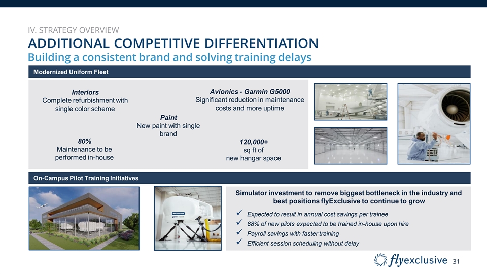 IV. STRATEGY OVERVIEW MAINTENANCE, REPAIR & OVERHAUL Extensive investments in maintenance, paint, interiors, and avionics MRO Benefits On-site Infrastructure ▪ 60,000+ sq ft facilities to perform 24/7 ▪ 24/7 operations ~3x the repairs in-house Operations MRO output ▪ 48,000 sq ft hangar completed in ▪ Performing repairs Q2 ‘22 with a fifth hangar under overnight (when aircraft construction is not flying) ~50% Lower ▪ Partial Part 145 certificate in Q3 ‘21 Downtime ▪ Improved planning and troubleshooting of repairs ▪ Improved uptime for fleet Maintenance superior to the industry (1) Savings average ▪ Increased revenues and profits ▪ New revenue streams External Revenue $2.7 million $14.5 million Projected MRO rd from 3 parties Stream 2022P Revenue 2023E Revenue Revenue Note: (1) flyExclusive Management estimate according to Company and industry statistics. 30