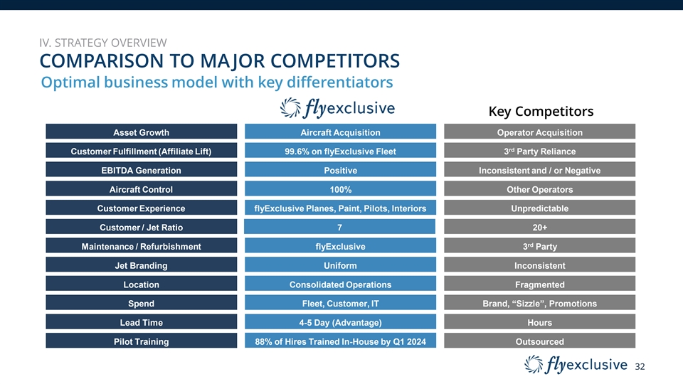 IV. STRATEGY OVERVIEW ADDITIONAL COMPETITIVE DIFFERENTIATION Building a consistent brand and solving training delays Modernized Uniform Fleet Avionics - Garmin G5000 Interiors Significant reduction in maintenance Complete refurbishment with costs and more uptime single color scheme Paint New paint with single brand 80% 120,000+ Maintenance to be sq ft of performed in-house new hangar space On-Campus Pilot Training Initiatives Simulator investment to remove biggest bottleneck in the industry and best positions flyExclusive to continue to grow ✓ Expected to result in annual cost savings per trainee ✓ 88% of new pilots expected to be trained in-house upon hire ✓ Payroll savings with faster training ✓ Efficient session scheduling without delay 31