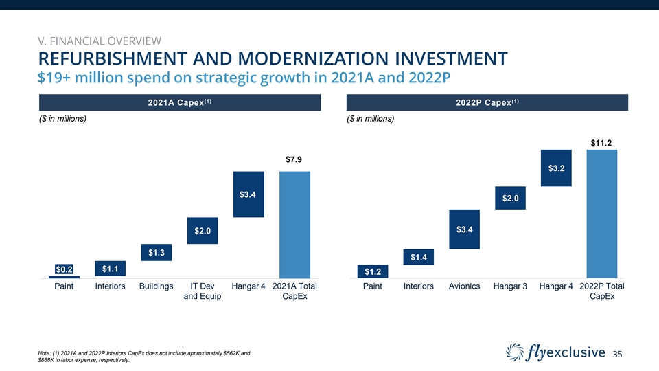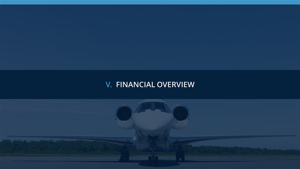V. FINANCIAL OVERVIEW REFURBISHMENT AND MODERNIZATION INVESTMENT $19+ million spend on strategic growth in 2021A and 2022P (1) (1) 2021A Capex 2022P Capex ($ in millions) ($ in millions) $11.2 $7.9 $3.2 $3.4 $2.0 $3.4 $2.0 $1.3 $1.4 $0.2 $1.1 $1.2 Paint Interiors Buildings IT Dev Hangar 4 2021A Total Paint Interiors Avionics Hangar 3 Hangar 4 2022P Total and Equip CapEx CapEx Note: (1) 2021A and 2022P Interiors CapEx does not include approximately $562K and 35 $868K in labor expense, respectively.