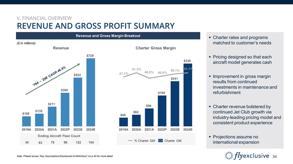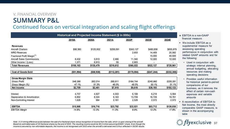 V. FINANCIAL OVERVIEW SUMMARY P&L Continued focus on vertical integration and scaling flight offerings Historical and Projected Income Statement ($ in 000s) EBITDA is a non-GAAP * financial measure 2019A 2020A 2021A 2022P 2023E 2024E ▪ We include EBITDA as a Revenues supplemental measure for assessing operating Aircraft Charters $98,360 $120,952 $208,091 $343,127 $480,658 $655,879 performance in conjunction with MRO Revenues 2,653 14,469 20,582 (1) related GAAP amounts and for - 15,000 40,500 Fractional Profit Margin the following: Aircraft Sales Commissions 8,432 5,613 2,466 11,340 12,000 12,000 Other Income / (Loss) 1,371 8,913 55 2,903 - - • Used in conjunction with Total Revenues $108,163 $135,479 $ 210,612 $ 360,022 $522,127 $728,961 strategic internal planning, annual budgeting, allocating resources and making Cost of Goods Sold ($51,994) ($58,938) ($112,281) ($179,994) ($247,244) ( $332,308) operating decisions Gross Margin Stats • Provides useful information Gross Profit $46,366 $62,014 $95,811 $164,744 $240,960 $335,281 for historical period-to-period Gross Margin (%) 47.1% 51.3% 46.0% 48.0% 50.1% 51.1% comparisons of our Net Income $2,709 $2,481 $7,915 $9,616 $38,193 $ 102,133 business, as it removes the effect of certain non-cash Interest 4,757 4,927 4,553 6,168 6,218 5,564 expenses and variable Depreciation & Amortization 6,892 8,324 9,163 13,709 16,729 19,761 amounts Non-Controlling Interest 1,628 984 2,161 2,528 2,572 2,572 ▪ A reconciliation of EBITDA to Net Income, the most directly EBITDA $15,986 $16,716 $23,792 $32,021 $63,712 $130,030 comparable GAAP measure, is EBITDA Margin 14.8% 12.3% 11.3% 8.9% 12.2% 17.8% shown in the accompanying table Note: (1) A timing difference exists between the sale of a fractional share versus recognition of income from the sale, which is upon closing of the aircraft. 37 Based on estimated sales of 25 fractional shares by the end of 2022. The resulting income would be $6.3 million assuming $250K / share. Even though the income is secured by non-refundable deposits, the income is not recognized until 2023 when the aircraft is delivered and is thus reflected in 2023E results.