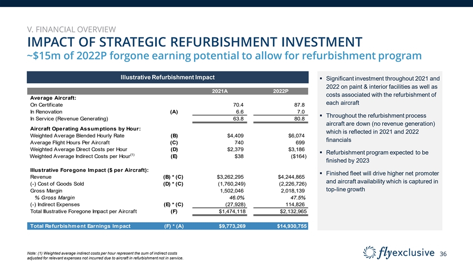 V. FINANCIAL OVERVIEW IMPACT OF STRATEGIC REFURBISHMENT INVESTMENT ~$15m of 2022P forgone earning potential to allow for refurbishment program Illustrative Refurbishment Impact ▪ Significant investment throughout 2021 and 2022 on paint & interior facilities as well as 2021A 2022P costs associated with the refurbishment of Average Aircraft: each aircraft On Certificate 70.4 87.8 In Renovation (A) 6.6 7.0 ▪ Throughout the refurbishment process In Service (Revenue Generating) 63.8 80.8 aircraft are down (no revenue generation) Aircraft Operating Assumptions by Hour: which is reflected in 2021 and 2022 Weighted Average Blended Hourly Rate (B) $4,409 $6,074 financials Average Flight Hours Per Aircraft (C) 740 699 Weighted Average Direct Costs per Hour (D) $2,379 $3,186 ▪ Refurbishment program expected to be (1) Weighted Average Indirect Costs per Hour (E) $38 ($164) finished by 2023 Illustrative Foregone Impact ($ per Aircraft): ▪ Finished fleet will drive higher net promoter Revenue (B) * (C) $3,262,295 $4,244,865 and aircraft availability which is captured in (-) Cost of Goods Sold (D) * (C) (1,760,249) (2,226,726) top-line growth Gross Margin 1,502,046 2,018,139 % Gross Margin 46.0% 47.5% (-) Indirect Expenses (E) * (C) (27,928) 114,826 Total Illustrative Foregone Impact per Aircraft (F) $1,474,118 $2,132,965 Total Refurbishment Earnings Impact (F) * (A) $9,773,269 $14,930,755 Note: (1) Weighted average indirect costs per hour represent the sum of indirect costs 36 adjusted for relevant expenses not incurred due to aircraft in refurbishment not in service.