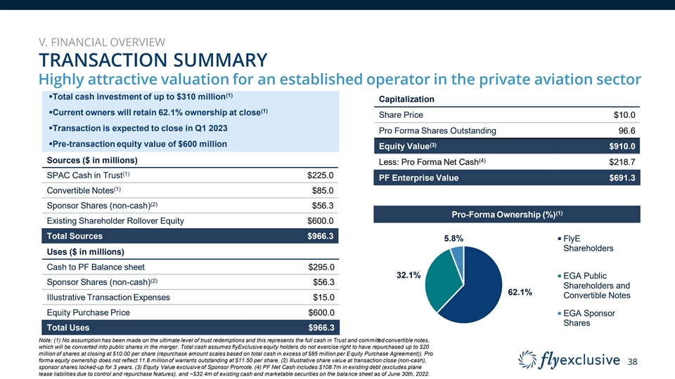 V. FINANCIAL OVERVIEW TRANSACTION SUMMARY Highly attractive valuation for an established operator in the private aviation sector (1) ▪Total cash investment of up to $310 million Capitalization (1) ▪Current owners will retain 62.1% ownership at close Share Price $10.0 ▪Transaction is expected to close in Q1 2023 Pro Forma Shares Outstanding 96.6 ▪Pre-transaction equity value of $600 million (3) Equity Value $910.0 Sources ($ in millions) (4) Less: Pro Forma Net Cash $218.7 (1) SPAC Cash in Trust $225.0 PF Enterprise Value $691.3 (1) Convertible Notes $85.0 (2) Sponsor Shares (non-cash) $56.3 (1) Pro-Forma Ownership (%) Existing Shareholder Rollover Equity $600.0 Total Sources $966.3 5.8% FlyE Shareholders Uses ($ in millions) Cash to PF Balance sheet $295.0 32.1% EGA Public (2) Sponsor Shares (non-cash) $56.3 Shareholders and 62.1% Convertible Notes Illustrative Transaction Expenses $15.0 Equity Purchase Price $600.0 EGA Sponsor Shares Total Uses $966.3 Note: (1) No assumption has been made on the ultimate level of trust redemptions and this represents the full cash in Trust and committed convertible notes, which will be converted into public shares in the merger. Total cash assumes flyExclusive equity holders do not exercise right to have repurchased up to $20 million of shares at closing at $10.00 per share (repurchase amount scales based on total cash in excess of $85 million per Equity Purchase Agreement)). Pro forma equity ownership does not reflect 11.8 million of warrants outstanding at $11.50 per share. (2) Illustrative share value at transaction close (non-cash), 38 sponsor shares locked-up for 3 years. (3) Equity Value exclusive of Sponsor Promote. (4) PF Net Cash includes $108.7m in existing debt (excludes plane lease liabilities due to control and repurchase features), and ~$32.4m of existing cash and marketable securities on the balance sheet as of June 30th, 2022.