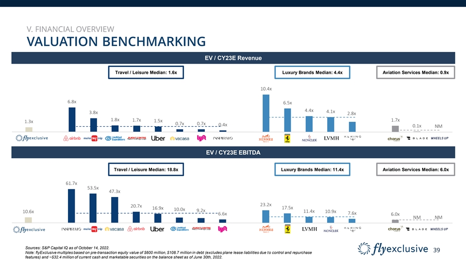 V. FINANCIAL OVERVIEW VALUATION BENCHMARKING EV / CY23E Revenue Travel / Leisure Median: 1.6x Luxury Brands Median: 4.4x Aviation Services Median: 0.9x 10.4x 6.8x 6.5x 4.4x 4.1x 3.8x 2.8x 1.8x 1.7x 1.7x 1.5x 1.3x 0.7x 0.7x 0.4x 0.1x NM EV / CY23E EBITDA Travel / Leisure Median: 18.8x Luxury Brands Median: 11.4x Aviation Services Median: 6.0x 61.7x 53.5x 47.3x 23.2x 20.7x 16.9x 17.5x 10.0x 9.2x 11.4x 10.9x 10.6x 7.6x 6.6x 6.0x NM NM Sources: S&P Capital IQ as of October 14, 2022. 39 Note: flyExclusive multiples based on pre-transaction equity value of $600 million, $108.7 million in debt (excludes plane lease liabilities due to control and repurchase features) and ~$32.4 million of current cash and marketable securities on the balance sheet as of June 30th, 2022.