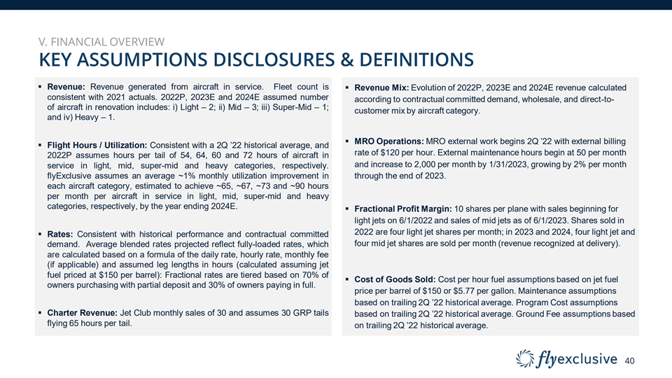 V. FINANCIAL OVERVIEW KEY ASSUMPTIONS DISCLOSURES & DEFINITIONS ▪ Revenue: Revenue generated from aircraft in service. Fleet count is ▪ Revenue Mix: Evolution of 2022P, 2023E and 2024E revenue calculated consistent with 2021 actuals. 2022P, 2023E and 2024E assumed number according to contractual committed demand, wholesale, and direct-to- of aircraft in renovation includes: i) Light – 2; ii) Mid – 3; iii) Super-Mid – 1; customer mix by aircraft category. and iv) Heavy – 1. ▪ MRO Operations: MRO external work begins 2Q ’22 with external billing ▪ Flight Hours / Utilization: Consistent with a 2Q ’22 historical average, and rate of $120 per hour. External maintenance hours begin at 50 per month 2022P assumes hours per tail of 54, 64, 60 and 72 hours of aircraft in and increase to 2,000 per month by 1/31/2023, growing by 2% per month service in light, mid, super-mid and heavy categories, respectively. flyExclusive assumes an average ~1% monthly utilization improvement in through the end of 2023. each aircraft category, estimated to achieve ~65, ~67, ~73 and ~90 hours per month per aircraft in service in light, mid, super-mid and heavy categories, respectively, by the year ending 2024E. ▪ Fractional Profit Margin: 10 shares per plane with sales beginning for light jets on 6/1/2022 and sales of mid jets as of 6/1/2023. Shares sold in 2022 are four light jet shares per month; in 2023 and 2024, four light jet and ▪ Rates: Consistent with historical performance and contractual committed four mid jet shares are sold per month (revenue recognized at delivery). demand. Average blended rates projected reflect fully-loaded rates, which are calculated based on a formula of the daily rate, hourly rate, monthly fee (if applicable) and assumed leg lengths in hours (calculated assuming jet fuel priced at $150 per barrel): Fractional rates are tiered based on 70% of ▪ Cost of Goods Sold: Cost per hour fuel assumptions based on jet fuel owners purchasing with partial deposit and 30% of owners paying in full. price per barrel of $150 or $5.77 per gallon. Maintenance assumptions based on trailing 2Q ’22 historical average. Program Cost assumptions ▪ Charter Revenue: Jet Club monthly sales of 30 and assumes 30 GRP tails based on trailing 2Q ’22 historical average. Ground Fee assumptions based flying 65 hours per tail. on trailing 2Q ’22 historical average. 40
