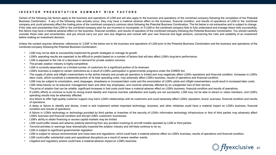 I N V E S T O R P R E S E N T A T I O N S U M M A R Y R I S K F A C T O R S Certain of the following risk factors apply to the business and operations of LGM and will also apply to the business and operations of the combined company following the completion of the Potential Business Combination. If any of the following risks actually occur, they may have a material adverse effect on the business, financial condition, and results of operations of LGM or the combined company and could adversely affect the trading price of the combined company’s common stock following the Potential Business Combination. The list below is not exhaustive and is subject to change. If the risks and uncertainties that LGM or the combined company plan for are incorrect or incomplete, or if LGM or the combined company fails to fully understand and manage these risks successfully, this failure may have a material adverse effect on the business, financial condition, and results of operation of the combined company following the Potential Business Combination. You should carefully consider these risks and uncertainties, and you should carry out your own due diligence and consult with your own financial and legal advisors, concerning the risks and suitability of an investment before making an investment decision. Unless the context requires otherwise, references to “LGM” in the below are to the business and operations of LGM prior to the Potential Business Combination and the business and operations of the combined company following the Potential Business Combination. • LGM may not be able to successfully implement its growth strategies or manage its growth. • LGM’s operating results are expected to be difficult to predict based on a number of factors that will also affect LGM’s long-term performance. • LGM is exposed to the risk of a decrease in demand for private aviation services. • The private aviation industry is highly competitive. • LGM is currently dependent on a limited number of customers for a significant portion of its revenues. • LGM’s business is subject to certain restrictions as a result of LGM’s participation in governmental programs under the CARES Act. • The supply of pilots and inflight crewmembers to the airline industry and private jet operators is limited and may negatively affect LGM’s operations and financial condition. Increases in LGM’s labor costs, which constitute a substantial portion of its total operating costs, may adversely affect LGM’s business, results of operations and financial condition. • LGM may be subject to unionization, work stoppages, slowdowns or increased labor costs and the unionization of LGM’s pilots and inflight crewmembers could result in increased labor costs. • LGM relies heavily on its executive management team and other key employees, and could be adversely affected by an unexpected loss of their service. • The price of aviation fuel can be volatile; significant increases in fuel costs could have a material adverse effect on LGM’s business, financial condition and results of operations. • If LGM’s efforts to continue to build its strong brand identity and improve member satisfaction and loyalty are not successful, LGM may not be able to attract or retain members, and LGM’s operating results may be adversely affected. • Any failure to offer high-quality customer support may harm LGM’s relationships with its customers and could adversely affect LGM’s reputation, brand, business, financial condition and results of operations. • A delay or failure to identify and devise, invest in and implement certain important technology, business, and other initiatives could have a material impact on LGM’s business, financial condition and results of operations. • A failure in LGM’s technology or technology provided by third parties or breaches of the security of LGM’s information technology infrastructure or that of third parties may adversely affect LGM’s business and financial condition and disrupt LGM’s customers’ businesses. • LGM’s ability to obtain financing or access capital markets may be limited. • LGM could suffer losses and adverse publicity stemming from any accident involving its aircraft models operated by LGM or third parties. • Terrorist activities or warnings have dramatically impacted the aviation industry and will likely continue to do so. • LGM is subject to significant governmental regulation. • LGM is subject to various environmental and noise laws and regulations, which could have a material adverse effect on LGM’s business, results of operations and financial condition. • LGM could suffer substantial costs and operational disruptions as a result of severe weather events. • Litigation and regulatory actions could have a material adverse impact on LGM’s business. 41
