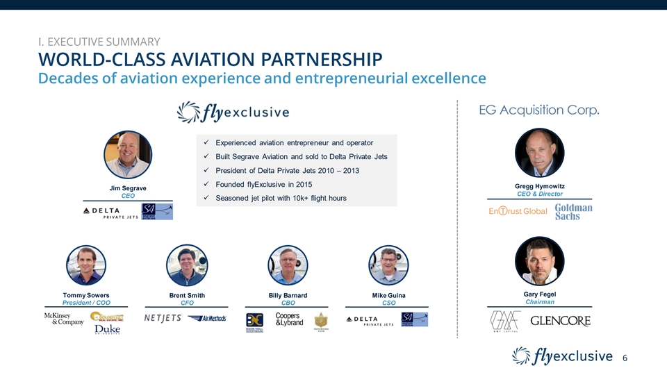 I. EXECUTIVE SUMMARY WORLD-CLASS AVIATION PARTNERSHIP Decades of aviation experience and entrepreneurial excellence ✓ Experienced aviation entrepreneur and operator ✓ Built Segrave Aviation and sold to Delta Private Jets ✓ President of Delta Private Jets 2010 – 2013 ✓ Founded flyExclusive in 2015 Gregg Hymowitz Jim Segrave CEO & Director CEO ✓ Seasoned jet pilot with 10k+ flight hours Gary Fegel Tommy Sowers Brent Smith Billy Barnard Mike Guina Chairman President / COO CFO CBO CSO 6