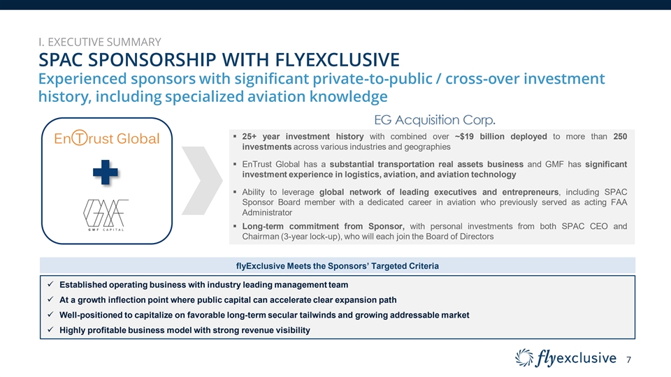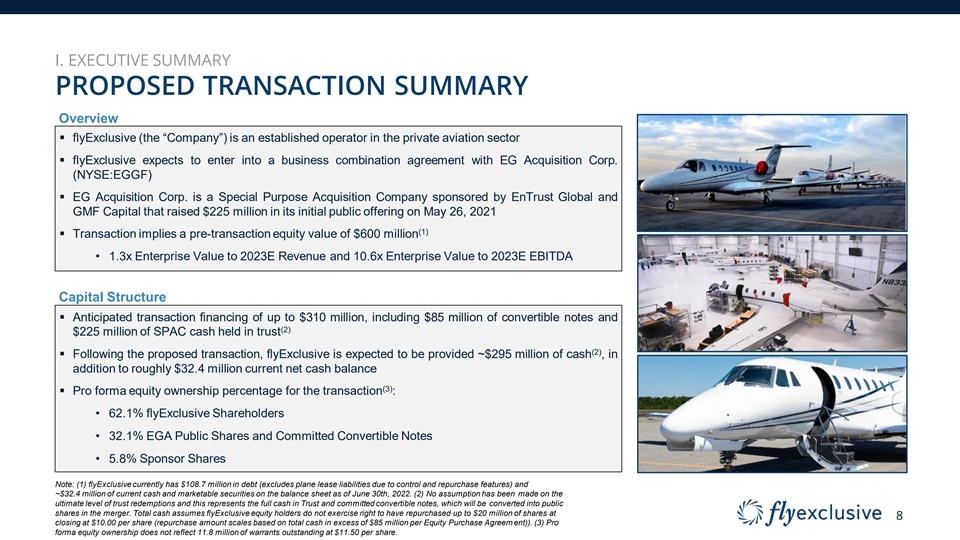I. EXECUTIVE SUMMARY PROPOSED TRANSACTION SUMMARY Overview ▪ flyExclusive (the “Company”) is an established operator in the private aviation sector ▪ flyExclusive expects to enter into a business combination agreement with EG Acquisition Corp. (NYSE:EGGF) ▪ EG Acquisition Corp. is a Special Purpose Acquisition Company sponsored by EnTrust Global and GMF Capital that raised $225 million in its initial public offering on May 26, 2021 (1) ▪ Transaction implies a pre-transaction equity value of $600 million • 1.3x Enterprise Value to 2023E Revenue and 10.6x Enterprise Value to 2023E EBITDA Capital Structure ▪ Anticipated transaction financing of up to $310 million, including $85 million of convertible notes and (2) $225 million of SPAC cash held in trust (2) ▪ Following the proposed transaction, flyExclusive is expected to be provided ~$295 million of cash , in addition to roughly $32.4 million current net cash balance (3) ▪ Pro forma equity ownership percentage for the transaction : • 62.1% flyExclusive Shareholders • 32.1% EGA Public Shares and Committed Convertible Notes • 5.8% Sponsor Shares Note: (1) flyExclusive currently has $108.7 million in debt (excludes plane lease liabilities due to control and repurchase features) and ~$32.4 million of current cash and marketable securities on the balance sheet as of June 30th, 2022. (2) No assumption has been made on the ultimate level of trust redemptions and this represents the full cash in Trust and committed convertible notes, which will be converted into public shares in the merger. Total cash assumes flyExclusive equity holders do not exercise right to have repurchased up to $20 million of shares at 8 closing at $10.00 per share (repurchase amount scales based on total cash in excess of $85 million per Equity Purchase Agreem ent)). (3) Pro forma equity ownership does not reflect 11.8 million of warrants outstanding at $11.50 per share.