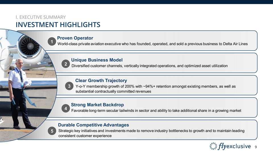 I. EXECUTIVE SUMMARY INVESTMENT HIGHLIGHTS Proven Operator 1 ▪ World-class private aviation executive who has founded, operated, and sold a previous business to Delta Air Lines Unique Business Model 2 ▪ Diversified customer channels, vertically integrated operations, and optimized asset utilization Clear Growth Trajectory 3▪ Y-o-Y membership growth of 200% with ~94%+ retention amongst existing members, as well as substantial contractually committed revenues Strong Market Backdrop 4 ▪ Favorable long-term secular tailwinds in sector and ability to take additional share in a growing market Durable Competitive Advantages ▪ Strategic key initiatives and investments made to remove industry bottlenecks to growth and to maintain leading 5 consistent customer experience 9