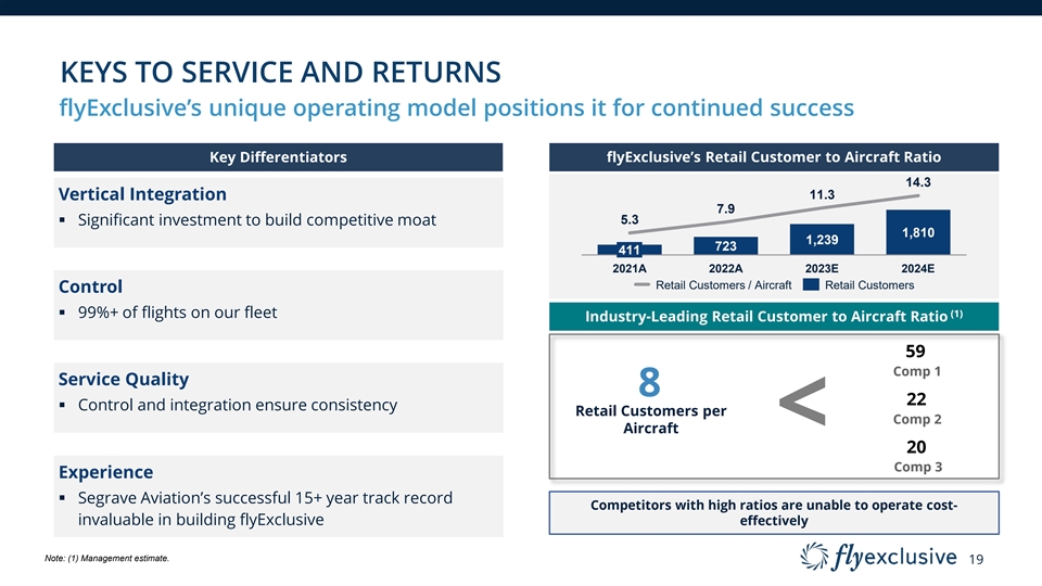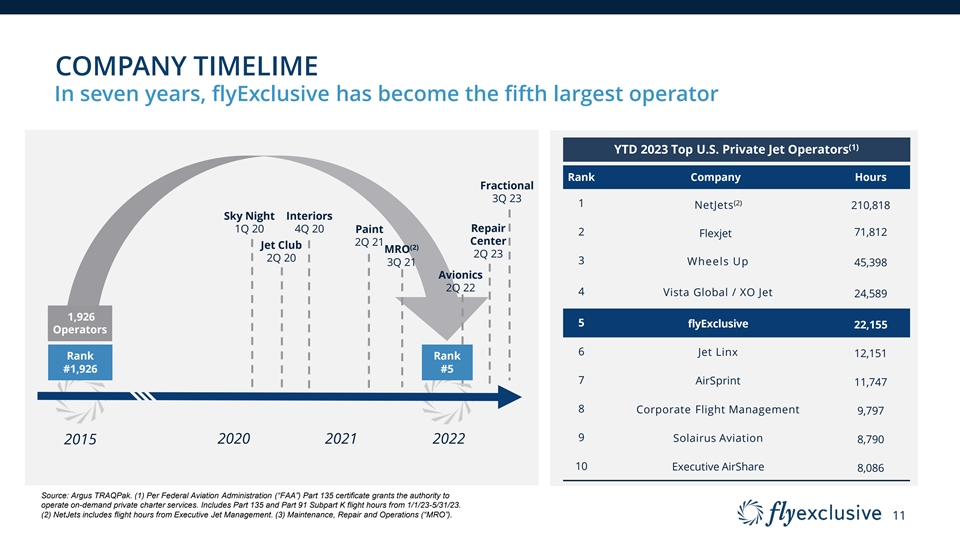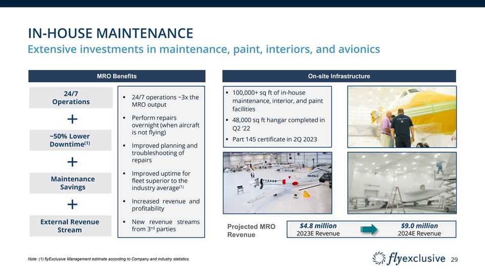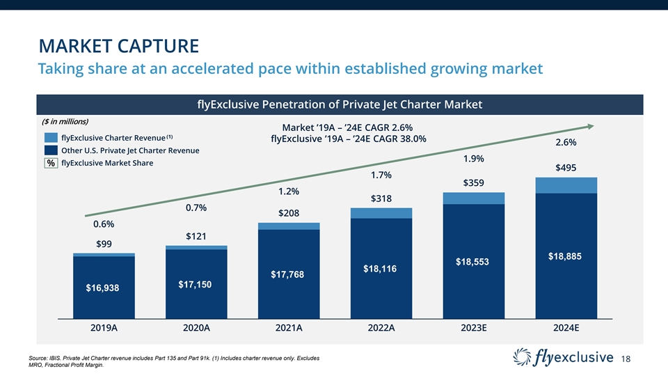MARKET CAPTURE Taking share at an accelerated pace within established growing market flyExclusive Penetration of Private Jet Charter Market ($ in millions) Market ’19A – ’24E CAGR 2.6% (1) flyExclusive Charter Revenue flyExclusive ’19A – ’24E CAGR 38.0% 2.6% Other U.S. Private Jet Charter Revenue 1.9% % flyExclusive Market Share $495 1.7% $359 1.2% $318 0.7% $208 0.6% $121 $99 $18,885 $18,553 $18,116 $17,768 $17,150 $16,938 2019A 2020A 2021A 2022A 2023E 2024E Source: IBIS. Private Jet Charter revenue includes Part 135 and Part 91k. (1) Includes charter revenue only. Excludes 18 MRO, Fractional Profit Margin.