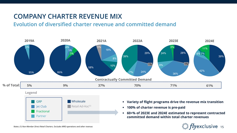ORGANIC GROWTH Consistent revenue and fleet expansion since inception despite market fluctuations Annual Revenue and Fleet Size ($ in millions) Revenue ’19A – ’24E CAGR 39.4% Light Super-Mid Fleet Size ’19A – ’24E CAGR 23.1% $521 Heavy Mid $367 Revenue $320 127 $208 110 $121 91 $99 78 63 45 2019A 2020A 2021A 2022A 2023E 2024E Fleet Range Light Midsize Super-Midsize Heavy Long-Range Citation Encore+: 10 Units Citation Excel/XLS/XLS+: 39 Units Citation Sovereign: 7 Units Gulfstream GIV-SP: 7 Units Citation CJ3/CJ3+: 15 Units Citation X:13 Units 14