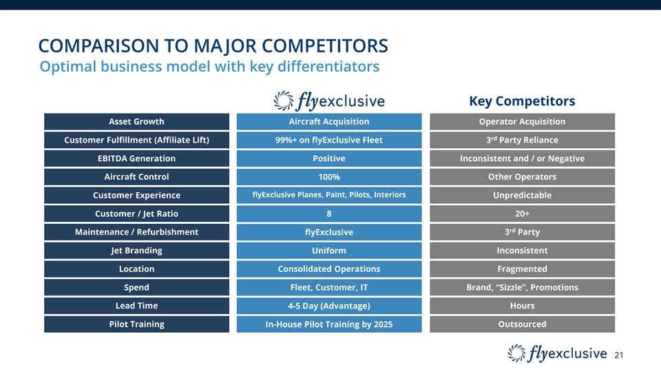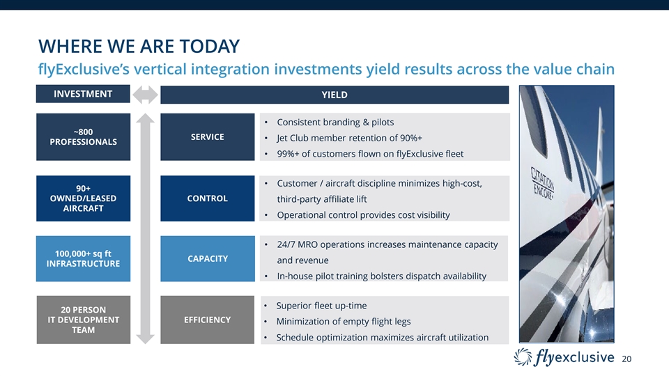 WHERE WE ARE TODAY flyExclusive’s vertical integration investments yield results across the value chain INVESTMENT YIELD • Consistent branding & pilots ~800 SERVICE • Jet Club member retention of 90%+ PROFESSIONALS • 99%+ of customers flown on flyExclusive fleet • Customer / aircraft discipline minimizes high-cost, 90+ OWNED/LEASED CONTROL third-party affiliate lift AIRCRAFT • Operational control provides cost visibility • 24/7 MRO operations increases maintenance capacity 100,000+ sq ft CAPACITY and revenue INFRASTRUCTURE • In-house pilot training bolsters dispatch availability • Superior fleet up-time 20 PERSON IT DEVELOPMENT EFFICIENCY • Minimization of empty flight legs TEAM • Schedule optimization maximizes aircraft utilization 20