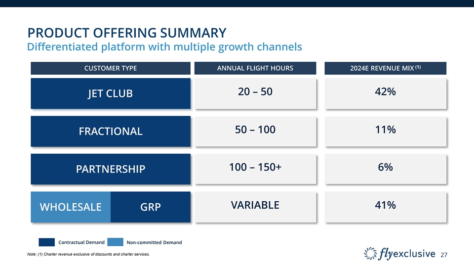 WHOLESALE AND GUARANTEED REVENUE PROGRAM Optimize revenue and fleet positions Overview § Wholesale is typically sold within 3 days of flight § flyExclusive utilizes Wholesale to maximize hours and fleet utilization § Wholesale serves as a resource for charter brokers and smaller fleet operators § Guaranteed Revenue Program (GRP) and Wholesale often share the same B2B customers, whereas GRP is protected with minimum guaranteed revenue with ensured favorable rates, terms, and reimbursements § GRP flights generate revenue, including empty legs (repositioning) § Top Wholesale Customers 26