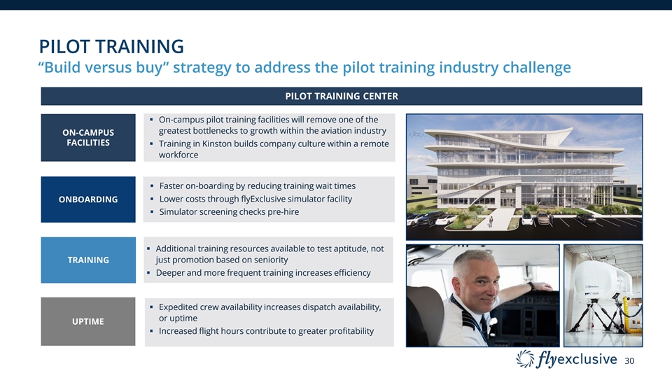 PILOT TRAINING “Build versus buy” strategy to address the pilot training industry challenge PILOT TRAINING CENTER § On-campus pilot training facilities will remove one of the greatest bottlenecks to growth within the aviation industry ON-CAMPUS FACILITIES § Training in Kinston builds company culture within a remote workforce § Faster on-boarding by reducing training wait times § Lower costs through flyExclusive simulator facility ONBOARDING § Simulator screening checks pre-hire § Additional training resources available to test aptitude, not TRAINING just promotion based on seniority § Deeper and more frequent training increases efficiency § Expedited crew availability increases dispatch availability, or uptime UPTIME § Increased flight hours contribute to greater profitability 30