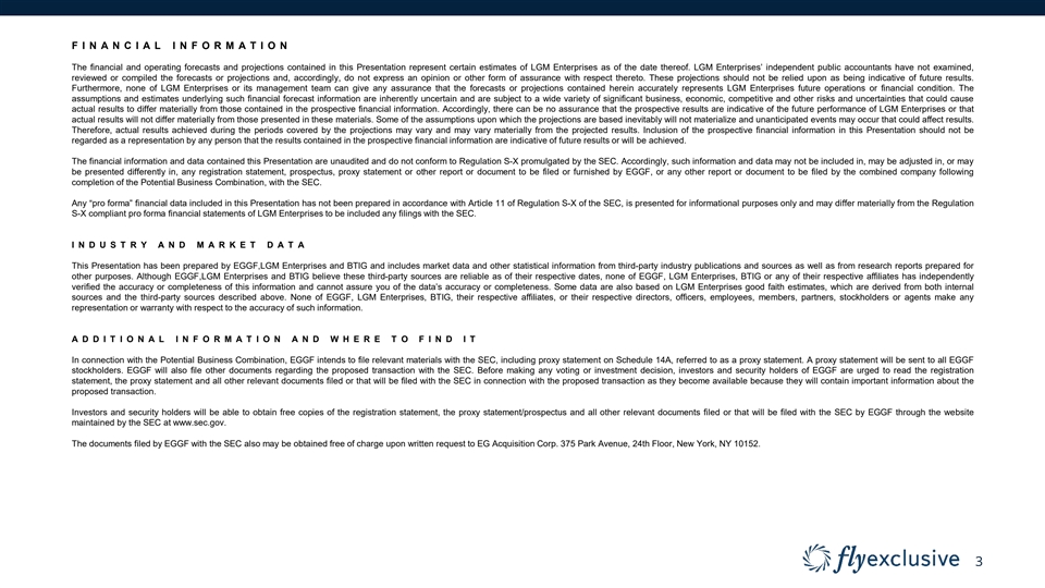 DI S CL A I M E RS AN D O T H E R IM P OR T A N T IN F OR M A T ION This presentation (this “Presentation”) is provided for informational purposes only and has been prepared to assist interested parties in making their own evaluation with respect to a potential acquisition by EG Acquisition Corp (“EGGF”) of LGM Enterprises, LLC and its affiliates, together doing business as “flyExclusive” (together “LGM Enterprises”) and related transactions (the “Potential Business Combination”) and a potential proposed private offering of public equity (the “PIPE Offering”), and for no other purpose. By reviewing or reading this Presentation, you will be deemed to have agreed to the obligations and restrictions set out below. This Presentation and any oral statements made in connection with this Presentation do not constitute an offer to sell, or a solicitation of an offer to buy, or a recommendation to purchase, any securities in any jurisdiction, or the solicitation of any proxy, vote, consent or approval in any jurisdiction in connection with the Potential Business Combination, the PIPE Offering or any related transactions, nor shall there be any sale, issuance or transfer of any securities in any jurisdiction where, or to any person to whom, such offer, solicitation or sale may be unlawful under the laws of such jurisdiction. This Presentation does not constitute either advice or a recommendation regarding any securities. No representations or warranties, express or implied, are given in, or in respect of, this Presentation. This Presentation is subject to updating, completion, revision, verification and further amendment. None of EGGF, LGM Enterprises, BTIG, LLC (“BTIG”) or their respective affiliates has authorized anyone to provide interested parties with additional or different information. No securities regulatory authority has expressed an opinion about the securities discussed in this Presentation and it is an offense to claim otherwise. Recipients of this Presentation are not to construe its contents, or any prior or subsequent communications from or with EGGF, LGM Enterprises, BTIG or their respective representatives, as investment, legal or tax advice. In addition, this Presentation does not purport to be all-inclusive or to contain all of the information that may be required to make a full analysis of EGGF, LGM Enterprises, the Potential Business Combination or the PIPE Offering. Recipients of this Presentation should each make their own evaluation of EGGF, LGM Enterprises, the Potential Business Combination and the PIPE Offering and of the relevance and adequacy of the information and should make such other investigations as they deem necessary. F O RW A RD - L OOK IN G IN F OR M A T ION This Presentation (and oral statements regarding the subjects of this Presentation) contains certain forward-looking statements within the meaning of the U.S. federal securities laws with respect to LGM Enterprises and the Potential Business Combination, including statements regarding the anticipated benefits of the Potential Business Combination, the anticipated timing of the Potential Business Combination, the products and services offered by LGM Enterprises and the markets in which it operates (including future market opportunities), LGM Enterprises’ projected future results, future financial condition and performance and expected financial impacts of the Potential Business Combination (including future revenue, pro forma enterprise value and cash balance), the satisfaction of closing conditions to the Potential Business Combination, the PIPE Offering and the level of redemptions of EGGF’s public stockholders, and LGM Enterprises’ expectations, intentions, strategies, assumptions or beliefs about future events, results of operations or performance or that do not solely relate to historical or current facts. These forward-looking statements generally are identified by the words “believe,” “project,” “expect,” “anticipate,” “estimate,” “intend,” “strategy,” “future,” “scales,” “representative of,” “valuation,” “potential,” “opportunity,” “plan,” “may,” “should,” “will,” “would,” “will be,” “will continue,” “will likely result,” and similar expressions. Forward-looking statements are predictions, projections and other statements about future events that are based on current expectations and assumptions and, as a result, are subject to risks and uncertainties. Many factors could cause actual future events to differ materially from the forward-looking statements in this Presentation, including but not limited to: (i) the risk that the Potential Business Combination and the PIPE Offering may not be completed in a timely manner or at all, which may adversely affect the price of EGGF’s securities, (ii) the risk that the Potential Business Combination may not be completed by EGGF’s business combination deadline and the potential failure to obtain an extension of the business combination deadline if sought by EGGF, (iii) the failure to satisfy the conditions to the consummation of the Potential Business Combination, including the approval of the business combination agreement by the stockholders of EGGF, the satisfaction of the minimum trust account amount following any redemptions by EGGF’s public stockholders (if applicable), and the receipt of certain governmental and regulatory approvals, (iv) the occurrence of any event, change or other circumstance that could give rise to the termination of the business combination agreement, (v) the effect of the announcement or pendency of the Potential Business Combination on LGM Enterprises’ business relationships, operating results, performance and business generally, (vi) risks that the Potential Business Combination disrupts current plans and operations of LGM Enterprises, (vii) the outcome of any legal proceedings that may be instituted ag