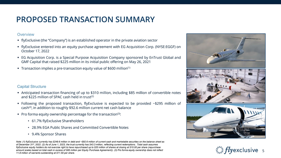 TRANSACTION SUMMARY Highly attractive valuation for an established operator in the private aviation sector (1) §Total cash investment of up to $310 million Capitalization (1) §Current owners will retain 61.7% ownership at close Share Price $10.0 §Transaction is expected to close in 3Q 2023 Pro Forma Shares Outstanding 96.6 §Pre-transaction equity value of $600 million (3) Equity Value $909.6 (4) ``` Less: Pro Forma Net Cash $223.6 (1) SPAC Cash in Trust $225.0 PF Enterprise Value $686.0 (1) Convertible Notes $85.0 (2) Sponsor Shares (non-cash) $56.4 (1) Pro-Forma Ownership (%) Existing Shareholder Rollover Equity $600.0 Total Sources $966.4 FlyE 9.4% Shareholders Uses ($ in millions) Cash to PF Balance sheet $295.0 EGA Public (2) 28.9% Sponsor Shares (non-cash) $56.4 Shareholders and 61.7% Convertible Notes Illustrative Transaction Expenses $15.0 Equity Purchase Price $600.0 EGA Sponsor Shares Total Uses $966.4 Note: (1) As of June 1, 2023, cash in trust amounted to $43.3 million. Total cash assumes flyExclusive equity holders do not exercise right to have repurchased up to $20 million of shares at closing at $10.00 per share (repurchase amount scales based on total cash in excess of $85 million per Equity Purchase Agreement)). Pro forma equity ownership does not reflect 11.8 million of warrants outstanding at $11.50 per share. (2) Illustrative share value at transaction close (non-cash), sponsor shares locked-up for 3 years. (3) Equity Value exclusive of Sponsor Promote. (4) PF Net Cash includes $249.6m in 38 st existing debt, and ~$92.6m of existing cash and marketable securities on the balance sheet as of December 31 , 2022.
