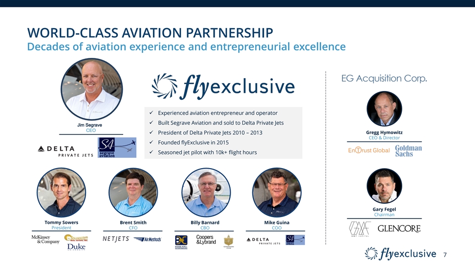 PROPOSED TRANSACTION SUMMARY Overview § flyExclusive (the “Company”) is an established operator in the private aviation sector § flyExclusive entered into an equity purchase agreement with EG Acquisition Corp. (NYSE:EGGF) on October 17, 2022 § EG Acquisition Corp. is a Special Purpose Acquisition Company sponsored by EnTrust Global and GMF Capital that raised $225 million in its initial public offering on May 26, 2021 (1) § Transaction implies a pre-transaction equity value of $600 million Capital Structure § Anticipated transaction financing of up to $310 million, including $85 million of convertible notes (2) and $225 million of SPAC cash held in trust § Following the proposed transaction, flyExclusive is expected to be provided ~$295 million of (2) cash , in addition to roughly $92.6 million current net cash balance (3) § Pro forma equity ownership percentage for the transaction : • 61.7% flyExclusive Shareholders • 28.9% EGA Public Shares and Committed Convertible Notes • 9.4% Sponsor Shares Note: (1) flyExclusive currently has $249.6 million in debt and ~$92.6 million of current cash and marketable securities on the balance sheet as st of December 31 , 2022. (2) As of June 1, 2023, the trust currently has $43.3 million, reflecting current redemptions.. Total cash assumes flyExclusive equity holders do not exercise right to have repurchased up to $20 million of shares at closing at $10.00 per share (repurchase amount scales based on total cash in excess of $85 million per Equity Purchase Agreement)). (3) Pro forma equity ownership does not reflect 5 11.8 million of warrants outstanding at $11.50 per share.