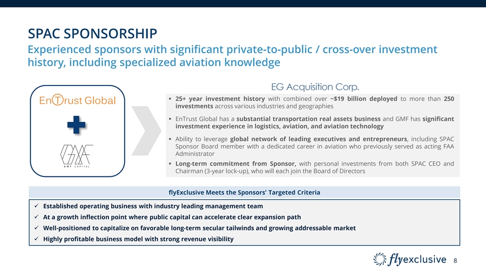 WORLD-CLASS AVIATION PARTNERSHIP Decades of aviation experience and entrepreneurial excellence ü Experienced aviation entrepreneur and operator ü Built Segrave Aviation and sold to Delta Private Jets Jim Segrave CEO ü President of Delta Private Jets 2010 – 2013 Gregg Hymowitz CEO & Director ü Founded flyExclusive in 2015 ü Seasoned jet pilot with 10k+ flight hours Gary Fegel Chairman Tommy Sowers Brent Smith Billy Barnard Mike Guina President CFO CBO COO 7