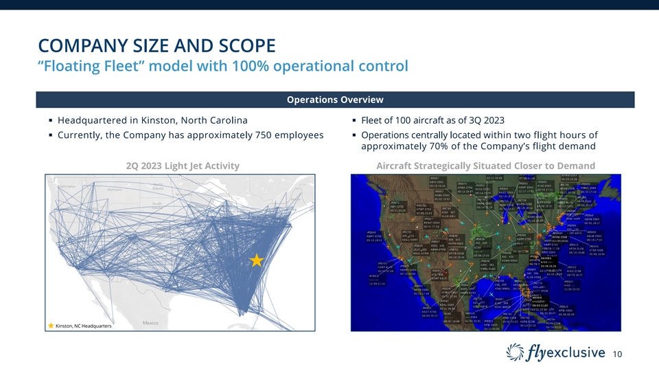 COMPANY TIMELIME In eight years, flyExclusive has become the fifth-largest operator (1) 1H 2023 Top U.S. Private Jet Operators Rank Company Hours Fractional 3Q 23 1 NetJets 344,424 Sky Night Interiors Repair 1Q 20 4Q 20 Paint 2 99,916 Vista Global / XO Jet Center 2Q 21 Jet Club (2) 2Q 23 MRO 2Q 20 3 Flexjet 3Q 21 99,355 Avionics 2Q 22 4 Wheels Up 70,253 1,926 5 flyExclusive 27,740 Operators 6 Solairus Aviation 26,265 Rank Rank #1,926 #5 7 PlaneSense 22,326 8 Jet Linx 15,773 9 AirSprint 2015 2020 2021 2022 14,027 10 Corporate Flight Management 11,976 Source: Private Jet Card Comparisons. (1) https://privatejetcardcomparisons.com/2023/08/31/2023s-30-biggest-private- jet-companies-through-june/. Includes Part 135 and Part 91 Subpart K flight hours. (2) Maintenance, Repair and Overhaul (“MRO”). 9