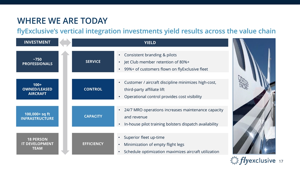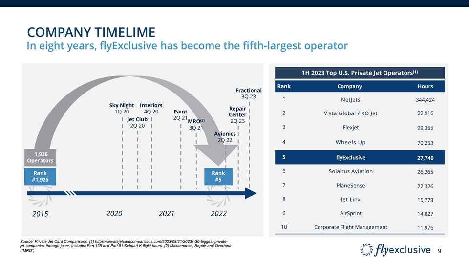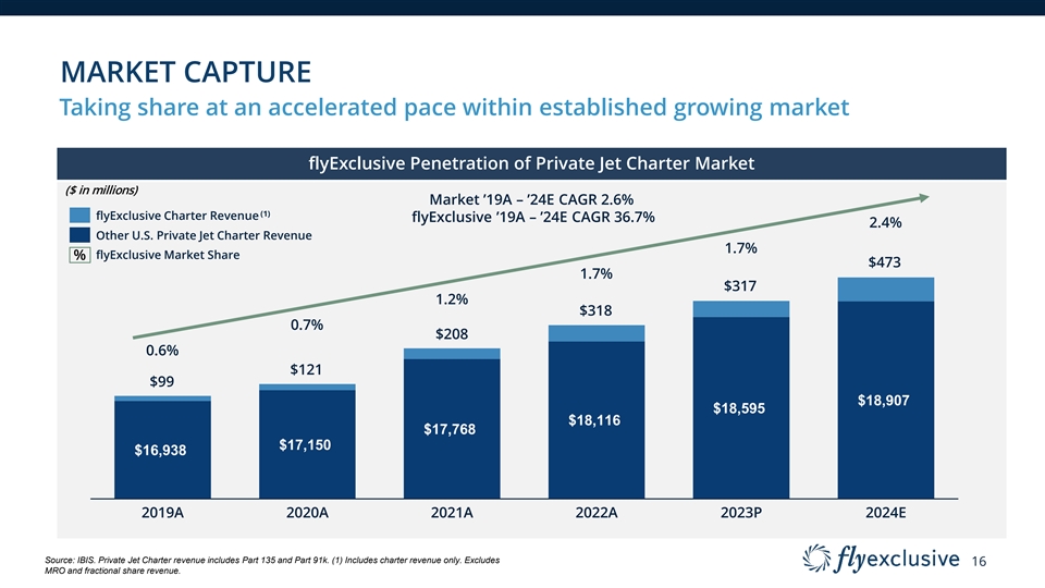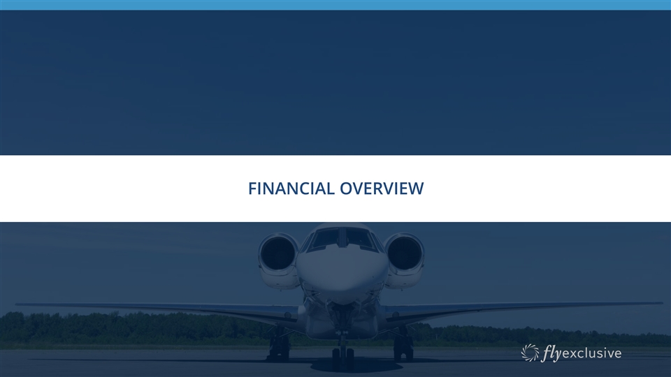 MARKET CAPTURE Taking share at an accelerated pace within established growing market flyExclusive Penetration of Private Jet Charter Market ($ in millions) Market ’19A – ’24E CAGR 2.6% (1) flyExclusive Charter Revenue flyExclusive ’19A – ’24E CAGR 36.7% 2.4% Other U.S. Private Jet Charter Revenue 1.7% % flyExclusive Market Share $473 1.7% $317 1.2% $318 0.7% $208 0.6% $121 $99 $18,907 $18,595 $18,116 $17,768 $17,150 $16,938 2019A 2020A 2021A 2022A 2023P 2024E Source: IBIS. Private Jet Charter revenue includes Part 135 and Part 91k. (1) Includes charter revenue only. Excludes 16 MRO and fractional share revenue.