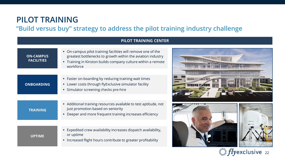 IN-HOUSE MAINTENANCE Extensive investments in maintenance, paint, interiors, and avionics MRO Benefits On-site Infrastructure § 100,000+ sq ft of in-house 24/7 § 24/7 operations ~3x the maintenance, interior, and paint Operations MRO output facilities § Perform repairs § 48,000 sq ft hangar completed in overnight (when aircraft Q2 ‘22 is not flying) ~50% Lower § Part 145 certificate in 2Q 2023 (1) Downtime § Improved planning and troubleshooting of repairs § Improved uptime for Maintenance fleet superior to the (1) Savings industry average § Increased revenue and profitability External Revenue § New revenue streams $3.9 million $8.1 million Projected MRO rd from 3 parties Stream 2023P Revenue 2024E Revenue Revenue Note: (1) flyExclusive Management estimate according to Company and industry statistics. 21