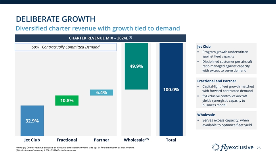 WHY FLYEXCLUSIVE WINS Focus on executing growth with operational control § Service excellence and consistency drive everything Vertical § Reliable and repeatable service execution is aligned with cost and return management Integration § Value is created simultaneously for customers, shareholders & flyExclusive with a single strategy § Consolidated operations optimize costs and synergies Maintenance § In-house maintenance and fleet control drive superior service and operating visibility and Staffing § Pilot sourcing and training are a key competitive differentiators § Technology enables and supplements our strategy § AI / ML dynamic pricing and apps developed in-house Technology § Technology focused primarily on improving operational efficiency and customer experiences § Deliberate, capital-light fleet growth matched with committed demand via Fractional and Partnership programs Asset Growth § Purposeful focus on select aircraft types drives scale and synergy benefits 23