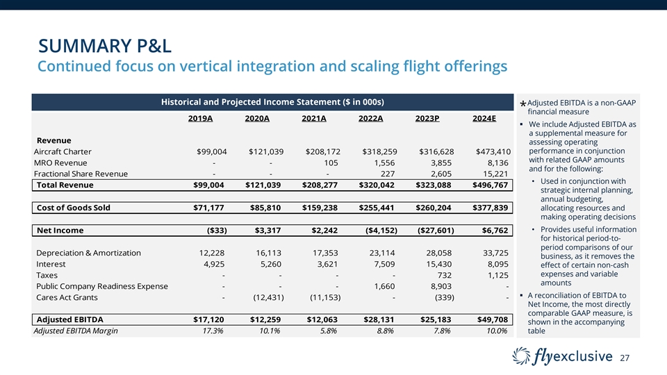 SUMMARY P&L Continued focus on vertical integration and scaling flight offerings Historical and Projected Income Statement ($ in 000s) Adjusted EBITDA is a non-GAAP * financial measure 2019A 2020A 2021A 2022A 2023P 2024E § We include Adjusted EBITDA as a supplemental measure for Revenue assessing operating performance in conjunction Aircraft Charter $99,004 $121,039 $208,172 $318,259 $316,628 $473,410 with related GAAP amounts MRO Revenue - - 105 1,556 3,855 8,136 and for the following: Fractional Share Revenue - - - 227 2,605 15,221 • Used in conjunction with Total Revenue $99,004 $121,039 $208,277 $320,042 $323,088 $496,767 strategic internal planning, annual budgeting, Cost of Goods Sold $71,177 $85,810 $159,238 $255,441 $260,204 $377,839 allocating resources and making operating decisions • Provides useful information Net Income ($33) $3,317 $2,242 ( $4,152) ($27,601) $6,762 for historical period-to- period comparisons of our Depreciation & Amortization 12,228 16,113 17,353 23,114 28,058 33,725 business, as it removes the Interest 4,925 5,260 3,621 7,509 15,430 8,095 effect of certain non-cash expenses and variable Taxes - - - - 732 1,125 amounts Public Company Readiness Expense - - - 1,660 8,903 - § A reconciliation of EBITDA to Cares Act Grants - (12,431) ( 11,153) - ( 339) - Net Income, the most directly comparable GAAP measure, is Adjusted EBITDA $17, 120 $12, 259 $12, 063 $28,131 $25, 183 $49, 708 shown in the accompanying Adjusted EBITDA Margin 17.3% 10.1% 5.8% 8.8% 7.8% 10.0% table 27