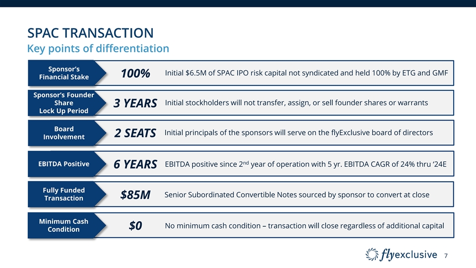 SPAC SPONSORSHIP Experienced sponsors with significant private-to-public / cross-over investment history, including specialized aviation knowledge § 25+ year investment history with combined over ~$19 billion deployed to more than 250 investments across various industries and geographies § EnTrust Global has a substantial transportation real assets business and GMF has significant investment experience in logistics, aviation, and aviation technology § Ability to leverage global network of leading executives and entrepreneurs, including SPAC Sponsor Board member with a dedicated career in aviation who previously served as acting FAA Administrator § Long-term commitment from Sponsor, with personal investments from both SPAC CEO and Chairman (3-year lock-up), who will each join the Board of Directors flyExclusive Meets the Sponsors’ Targeted Criteria ü Established operating business with industry leading management team ü At a growth inflection point where public capital can accelerate clear expansion path ü Well-positioned to capitalize on favorable long-term secular tailwinds and growing addressable market ü Highly profitable business model with strong revenue visibility 6