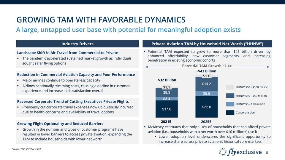 GROWING TAM WITH FAVORABLE DYNAMICS A large, untapped user base with potential for meaningful adoption exists Industry Drivers Private Aviation TAM by Household Net Worth (“HHNW”) § Potential TAM expected to grow to more than $43 billion driven by Landscape Shift in Air Travel from Commercial to Private enhanced affordability, new customer segments, and increasing § The pandemic accelerated sustained market growth as individuals penetration in existing economic cohorts sought safer flying options Potential TAM Growth ~1.4x ~$43 Billion Reduction in Commercial Aviation Capacity and Poor Performance $1.6 § Major airlines continue to operate less capacity ~$32 Billion $14.2 § Airlines continually trimming costs, causing a decline in customer HHNW $50 - $100 million $1.1 experience and increase in dissatisfaction overall $9.3 $5.5 HHNW $10 - $50 million $3.4 Reversed Corporate Trend of Cutting Executives Private Flights HHNW $5 - $10 million $22.0 § Previously cut corporate travel expenses now ubiquitously incurred $17.6 due to health concerns and availability of travel options Corporate Use 2021E 2025E Growing Flight Optionality and Reduced Barriers § McKinsey estimates that only ~10% of households that can afford private § Growth in the number and types of customer programs have aviation (i.e., households with a net worth over $10 million+) use it resulted in lower barriers to access private aviation, expanding the • Lower adoption level underscores the significant opportunity to TAM to include households with lower net worth increase share across private aviation’s historical core markets Source: Wall Street research. 8